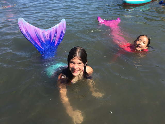 Learn to swim with mermaids. Our friends had these fun mermaid tails and made it look easy but when Nallie tried, she looked like a caterpillar trying to inch along. Nallie loved swimming with the mermaid tail though and has been begging for me to get her one now.